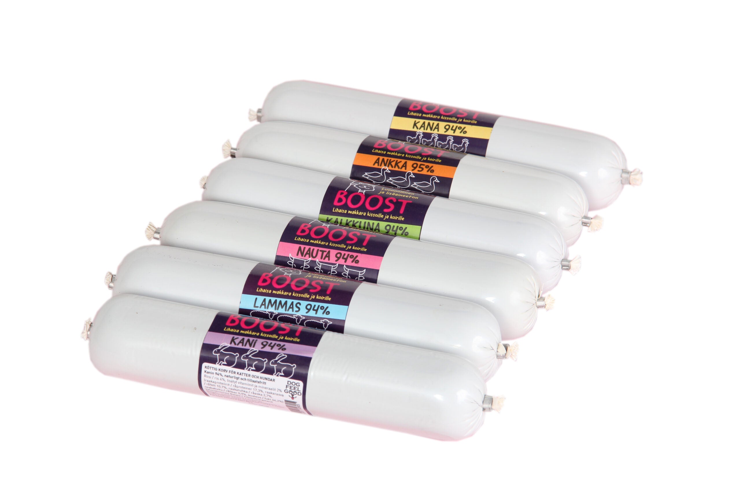BOOST sisältää lihan lisäksi 6 % riisiä ja 2 % merilevää sekä vitamiineja. Makkaroihin on lisätty A-,D- ja E-vitamiineja. Ei säilöntäaineita, väriaineita eikä lisättyä nestettä.