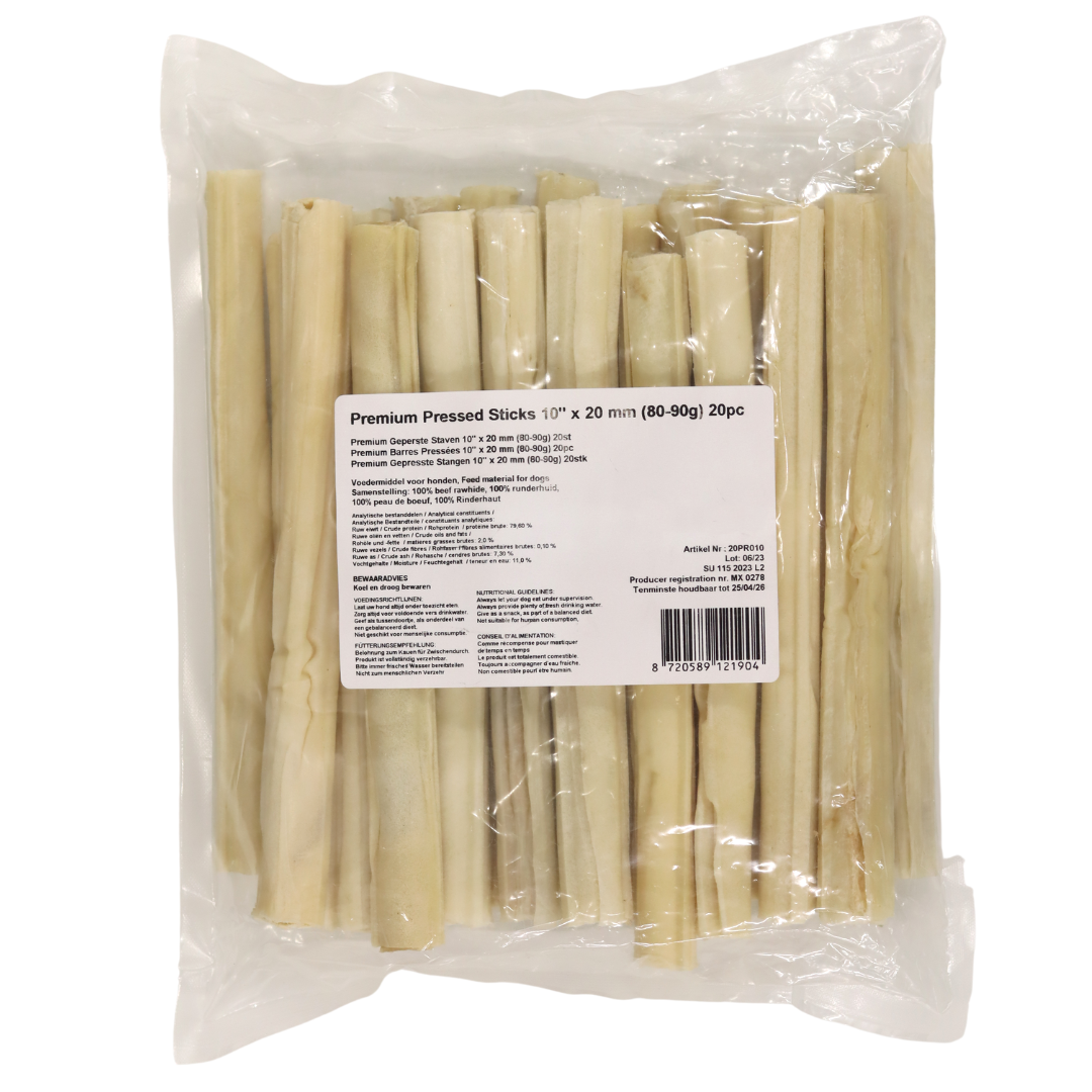 Kovempaa pureskelua kestävä puristerulla naudannahasta. Puristettu nahka on huomattavasti kovempaa kuin perinteinen rullattu nahka. Isokokoinen rulla sopii myös suureen suuhun! Suurpakkaus sisältää 20 herkullista ja kestävää puristerullaa.