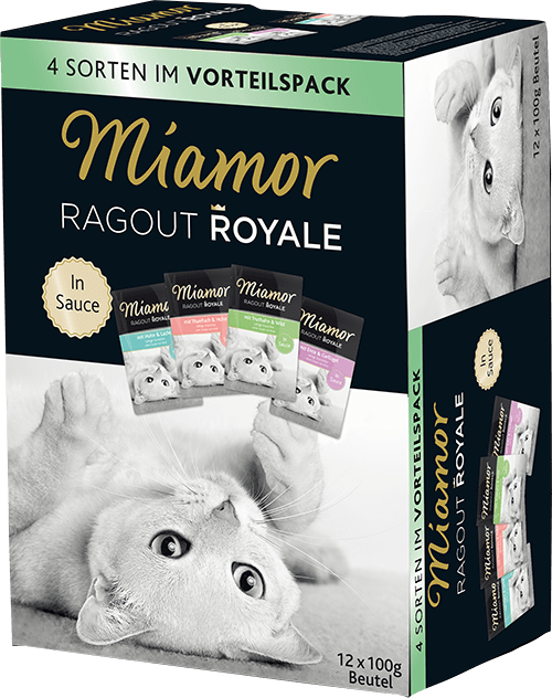 Miamor Ragout Royale -lajitelma sisältää 12 pussia täysaterioita 4 eri maussa: tonnikala & kana, ankka & siipikarja, kalkkuna & riista, kana & lohi. Hienoja lihahöystöpaloja herkullisessa kastikkeessa. Ei lisättyä nautaa. Ei sisällä väri- tai säilöntäaineita.